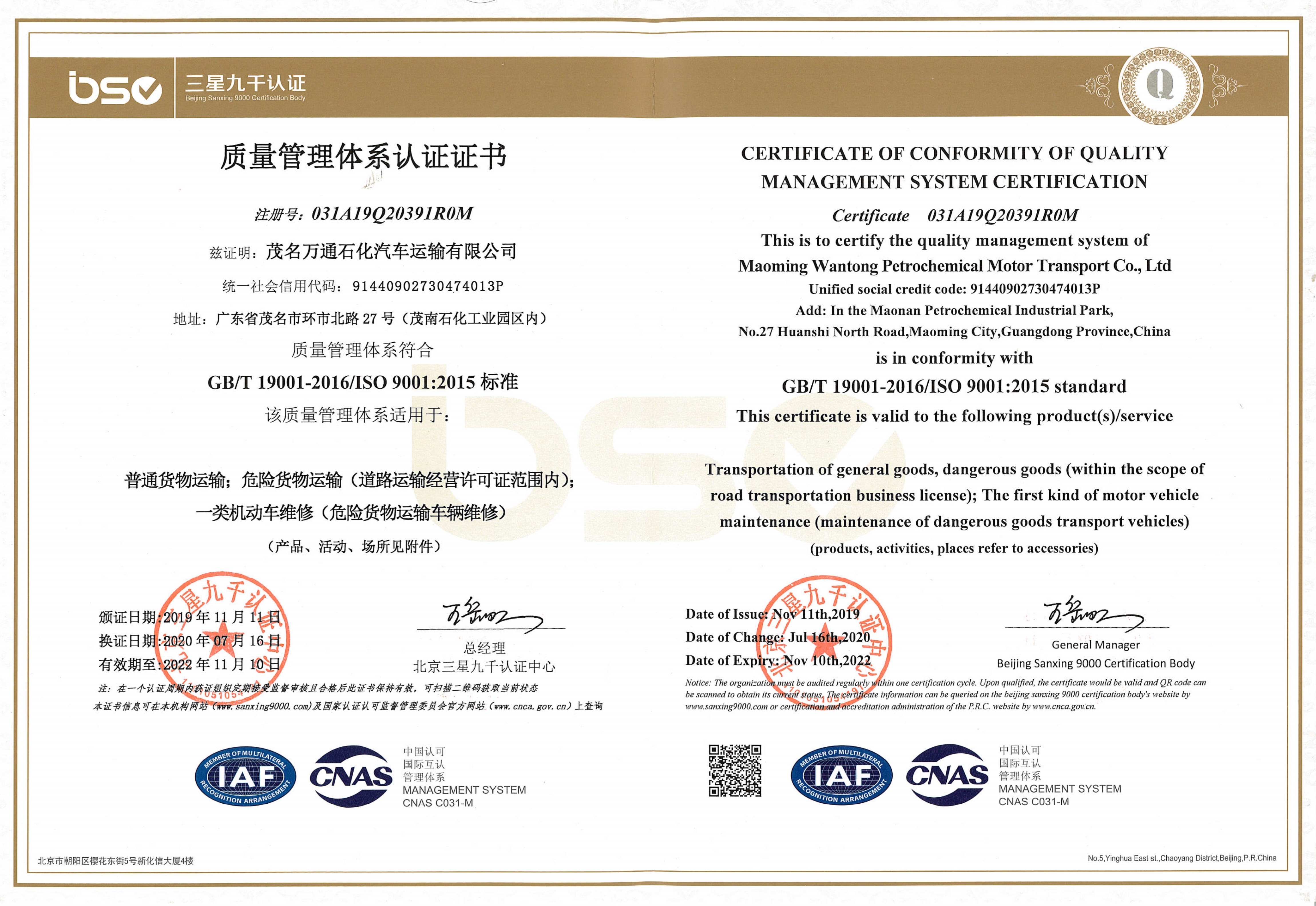 ISO質(zhì)量管理體系證書